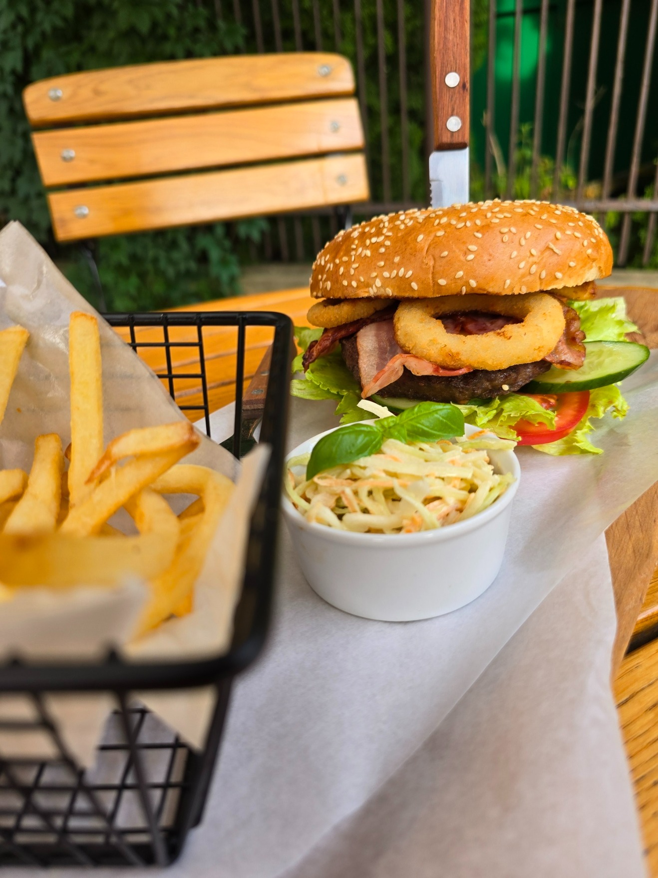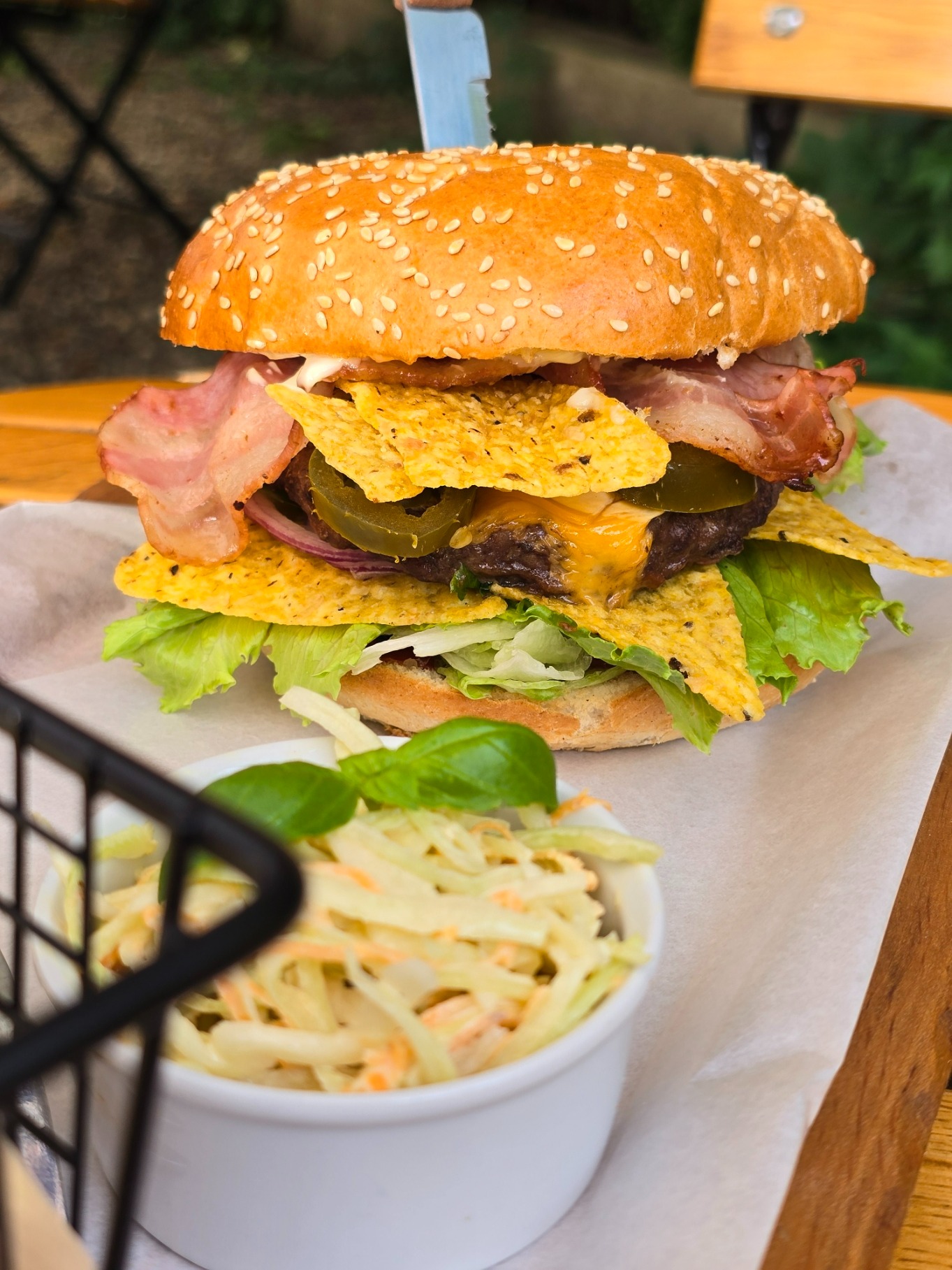 160g wołowina, mozzarella, pesto z suszonych pomidorów, szynka dojrzewająca, rukola, pomidor, 100g frytek z batatów, coleslaw