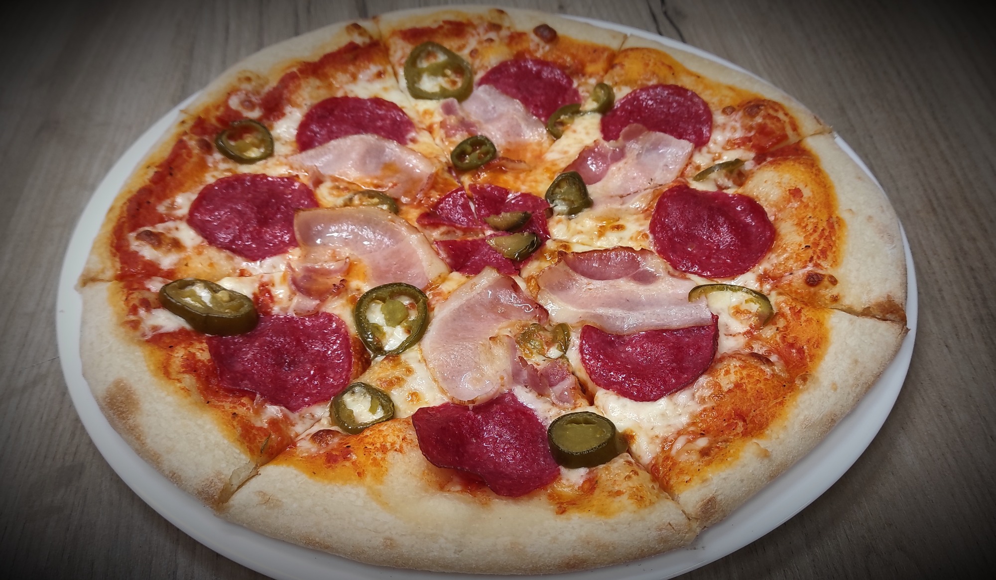 sos pelati (bazowy), mozzarella, salami, boczek, papryczki jalapeño, czosnek