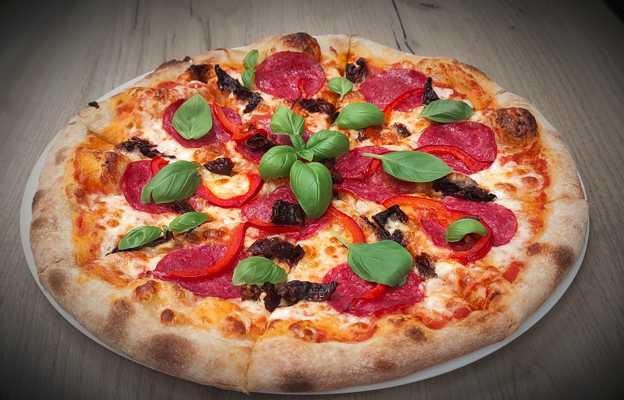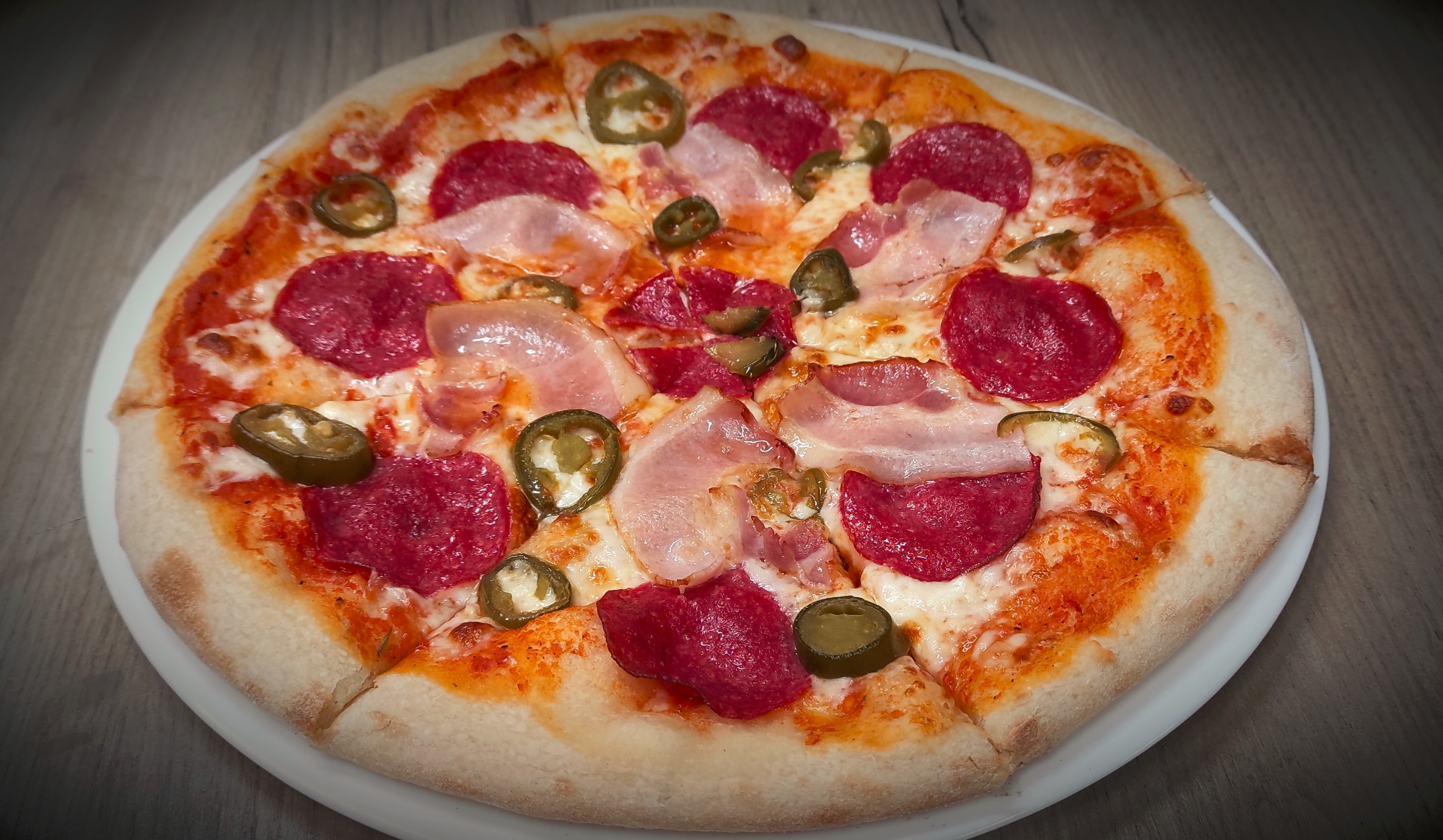 sos pelati (bazowy), mozzarella, salami, boczek, papryczki jalapeño, oliwa czosnkowa15. Palermo