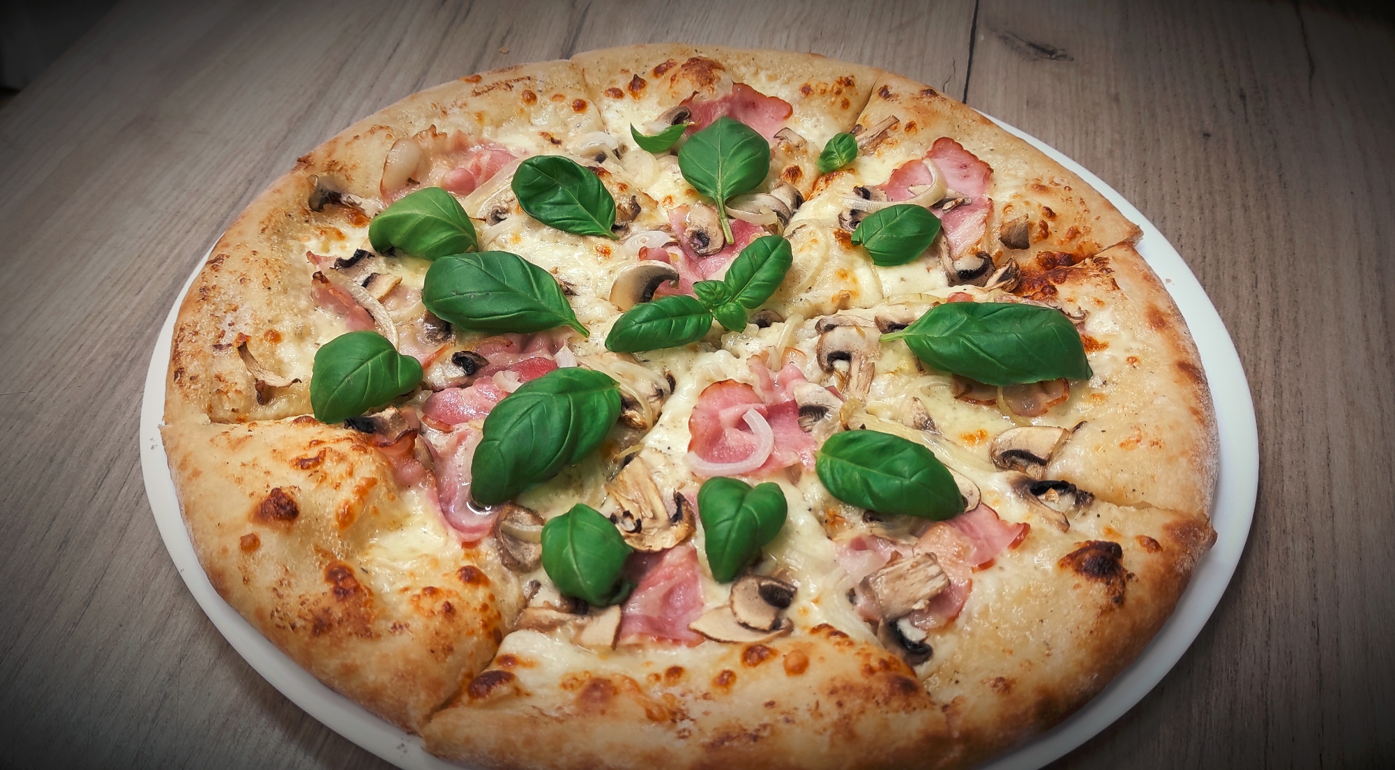 sos czosnkowy (bazowy), mozzarella, pieczarki, cebula, bazylia, boczek6. Capricciosa