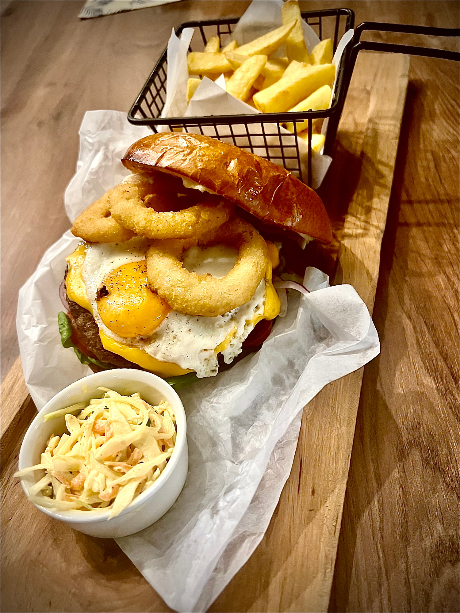 kurczak opiekany (podwójne mięso +3,90 zł), frytki, mozzarella, surówka, sos -