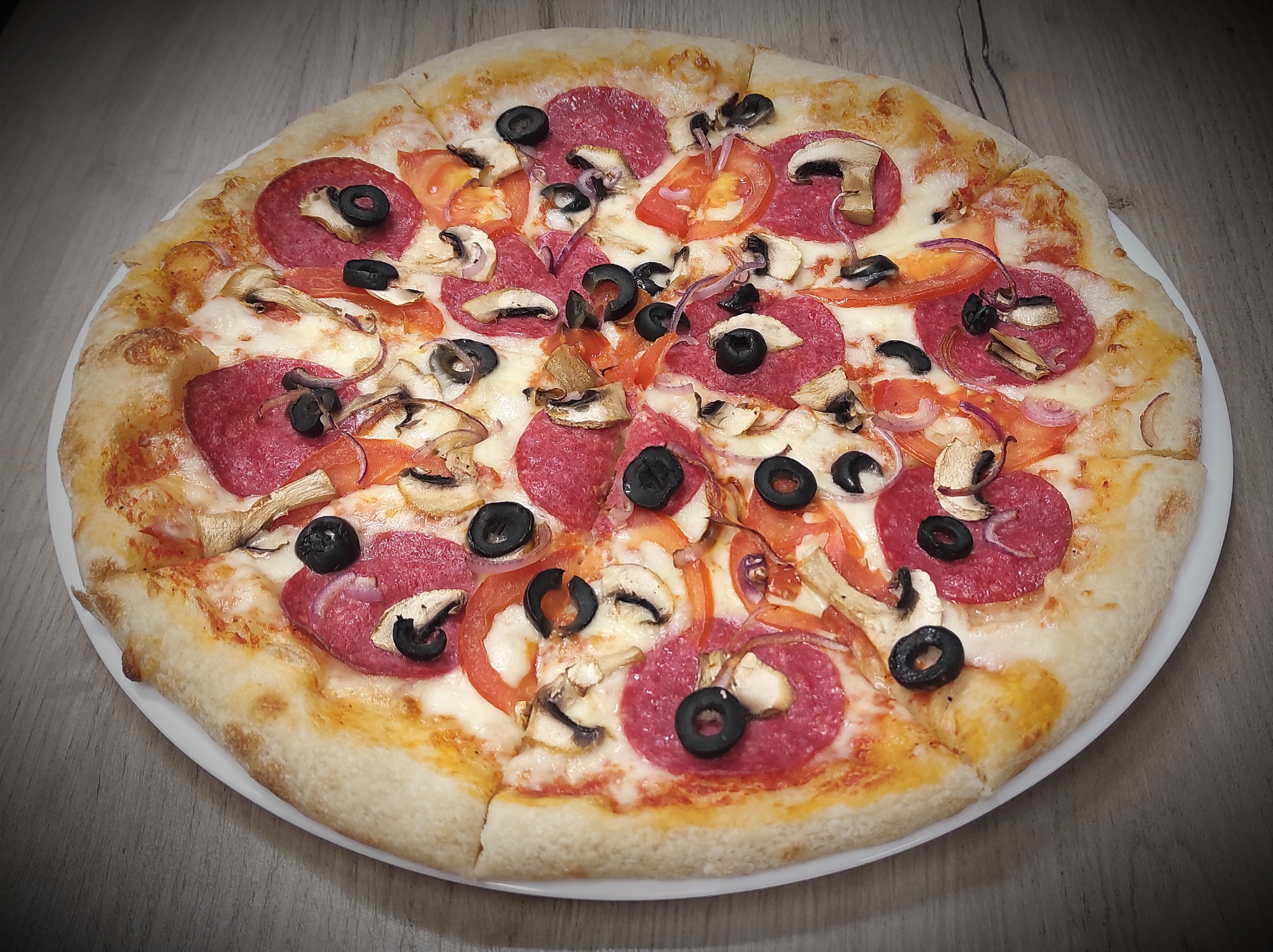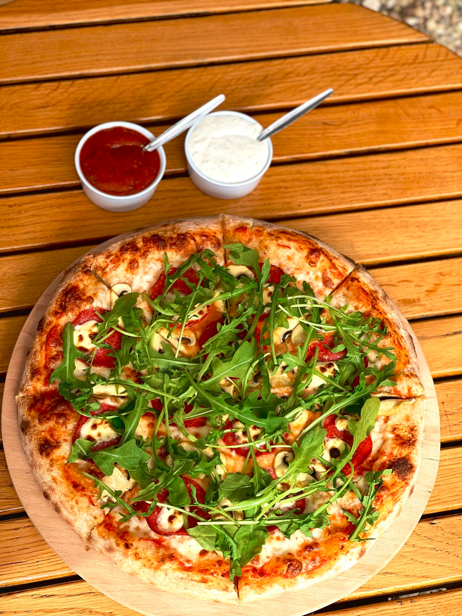 sos pelati (bazowy), mozzarella, mascarpone, salami, pieczarki, rukola