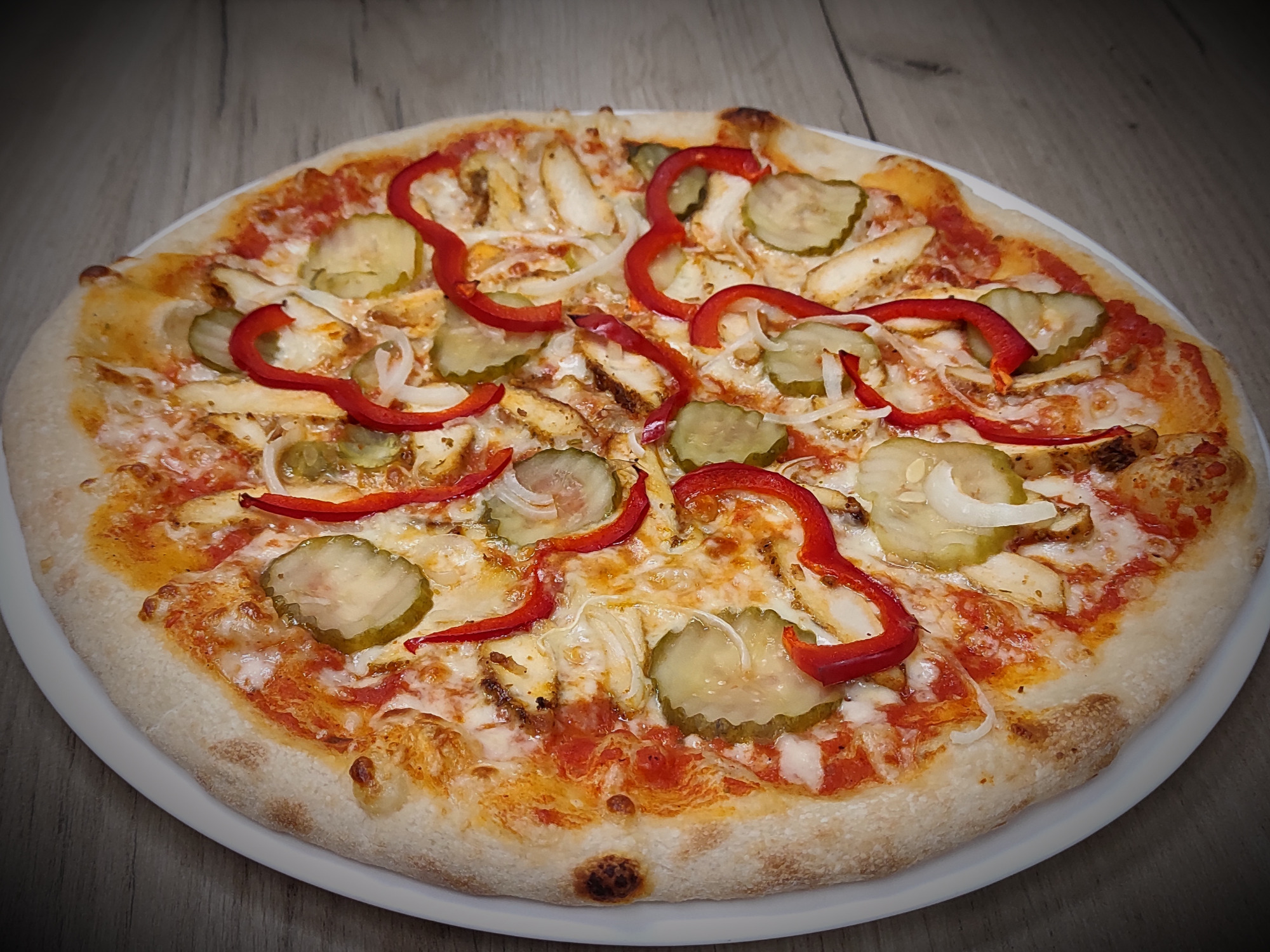 sos pelati (bazowy), mozzarella, kurczak, cebula, papryka słodka, ogórki konserwowe20. Teściowej