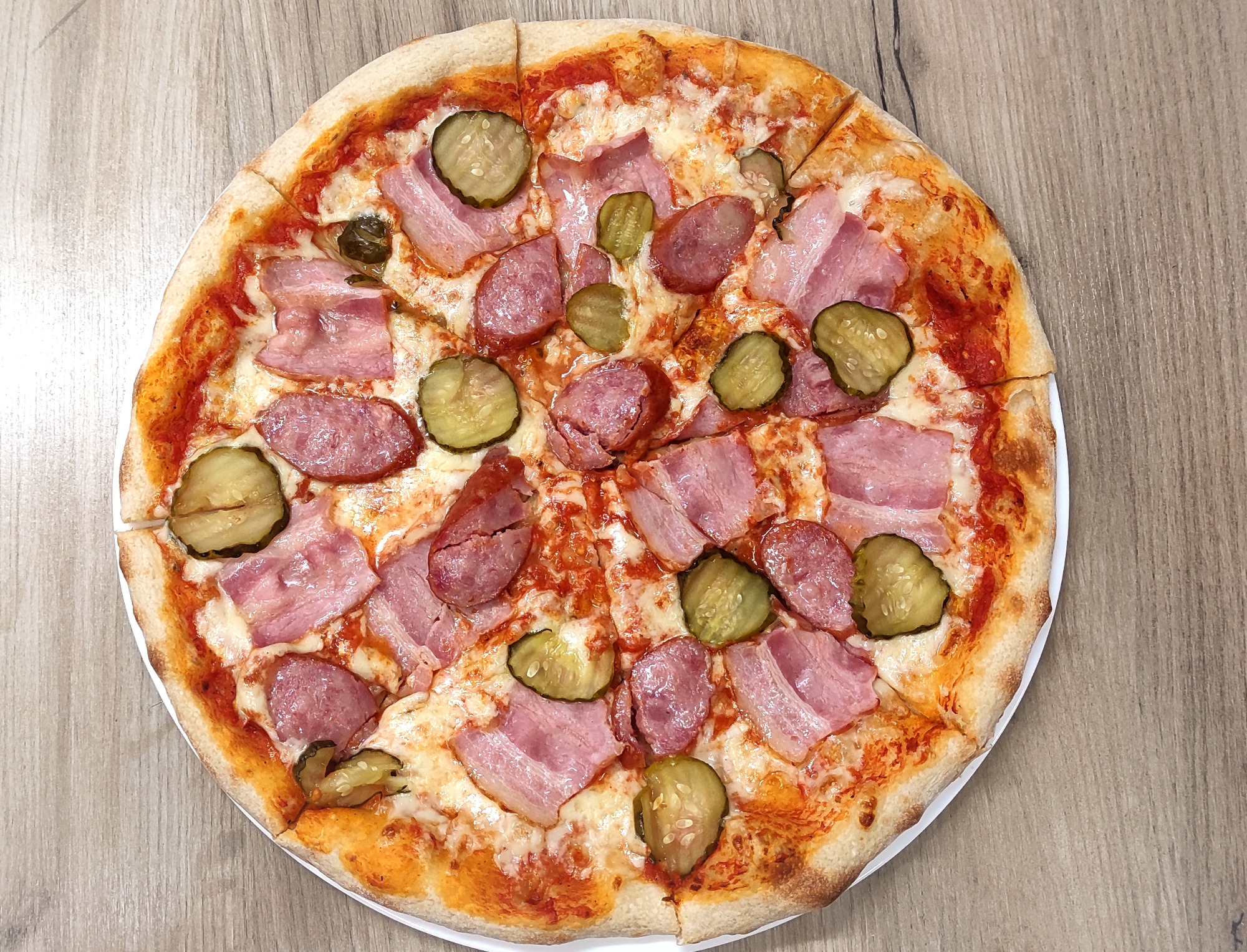 sos pelati (bazowy), mozzarella, boczek, kiełbasa, ogórki konserwowe
