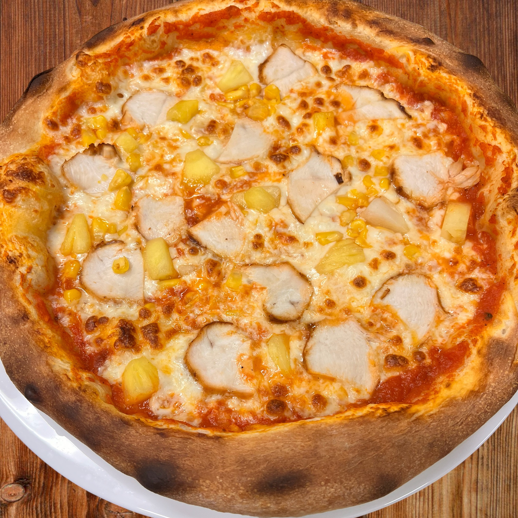 sos pelati (bazowy), mozzarella, kurczak, kukurydza, ananas