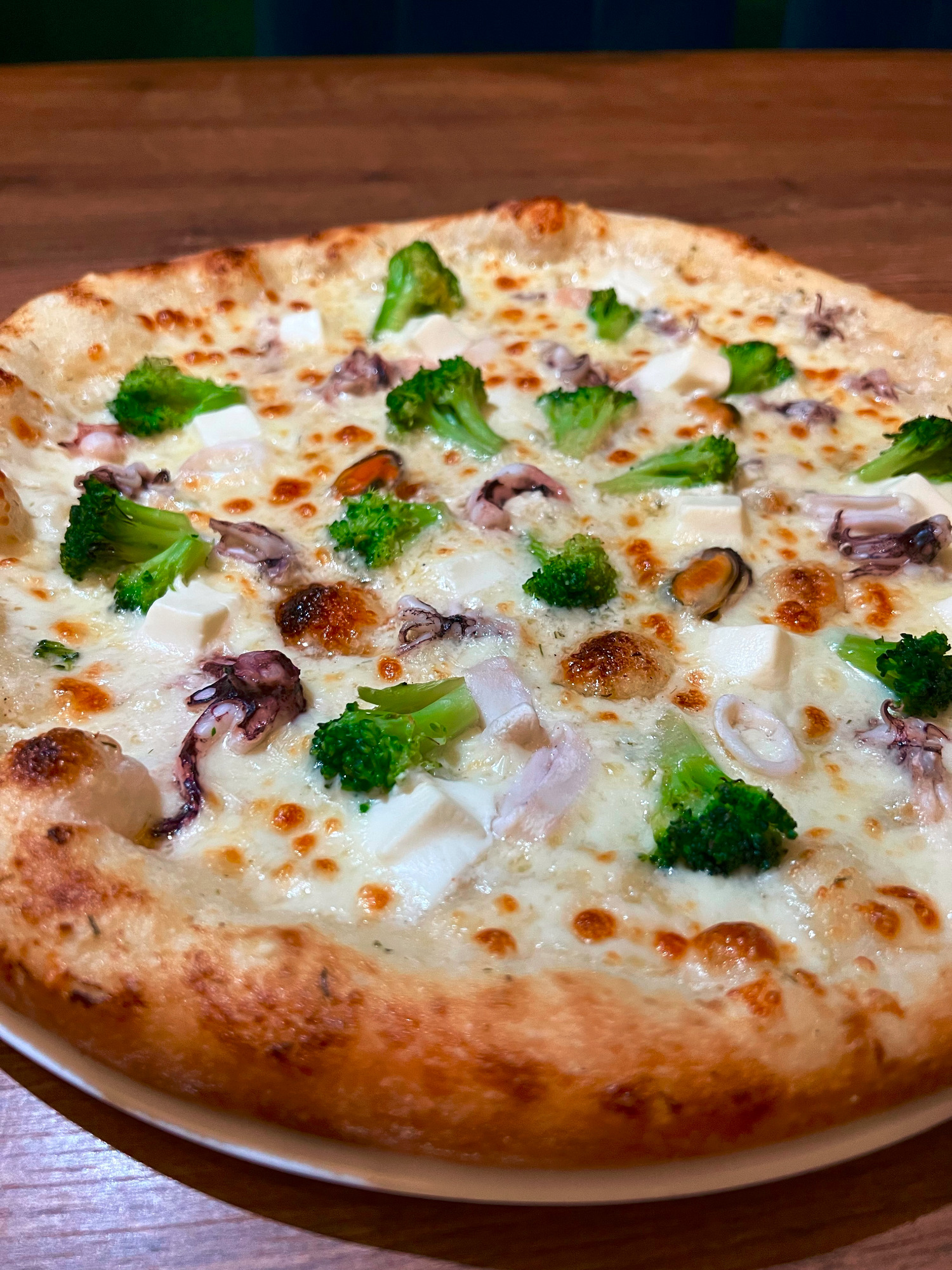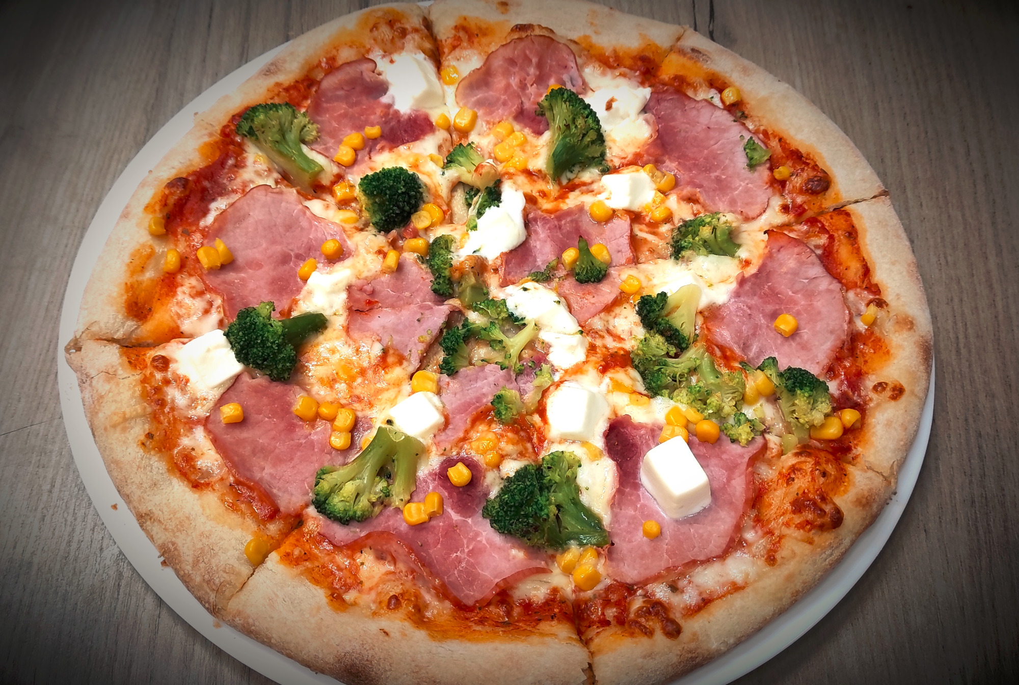 sos pelati (bazowy), mozzarella, brokuły, szynka, kukurydza, ser typu feta