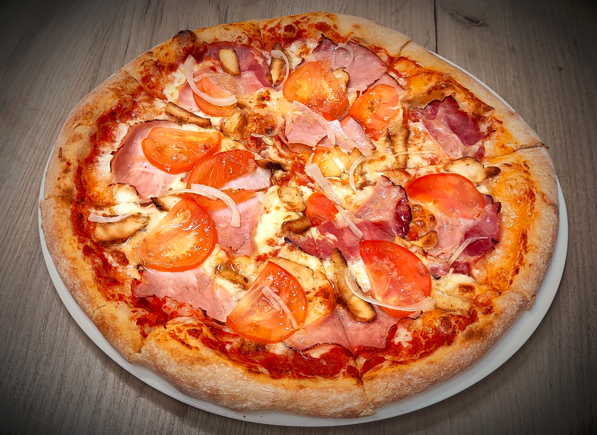sos pelati (bazowy), mozzarella, kurczak, szynka, pomidor, cebula, oliwa czosnkowa