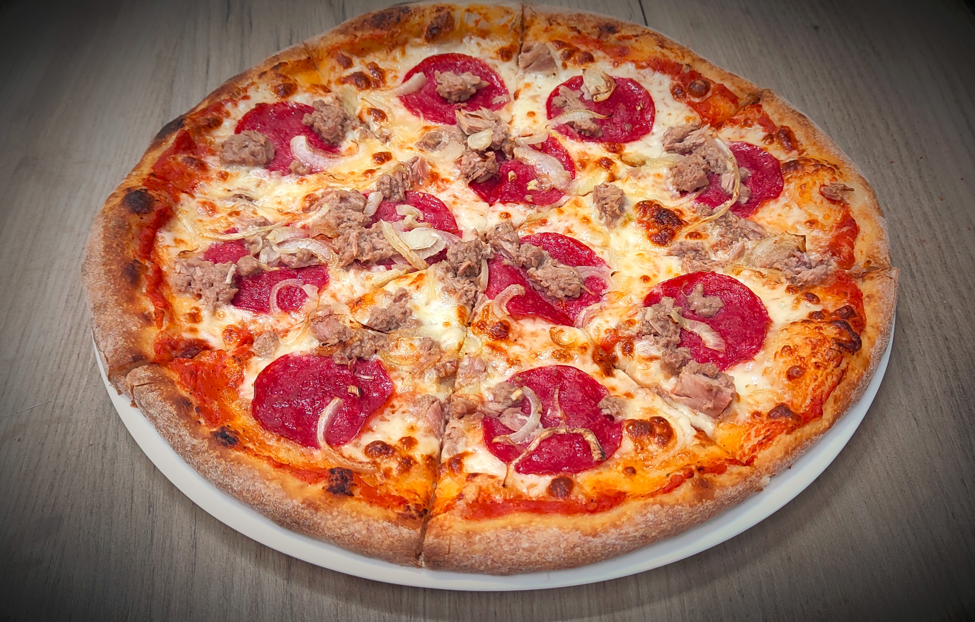 sos pelati (bazowy), mozzarella, tuńczyk, cebula, salami8. Pepperoni