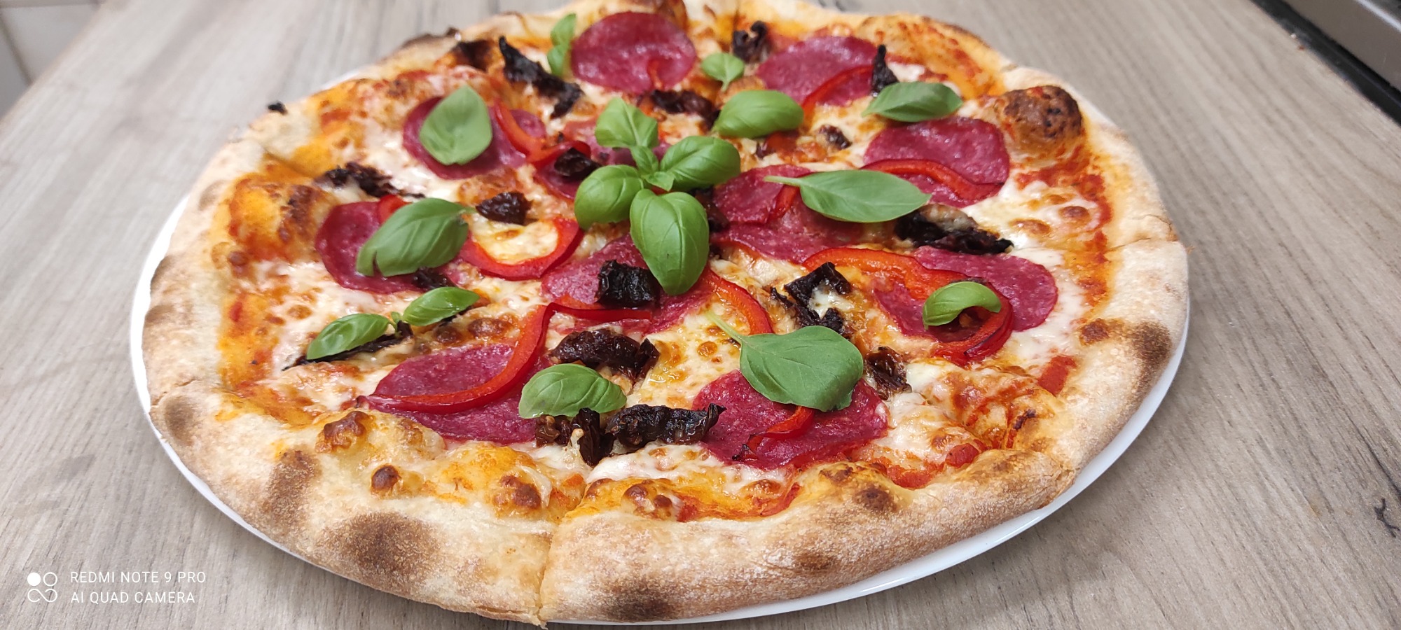 sos pelati (bazowy), mozzarella, papryka słodka, oliwa czosnkowa, bazylia, pomidory suszone, salami9. Brokułowa