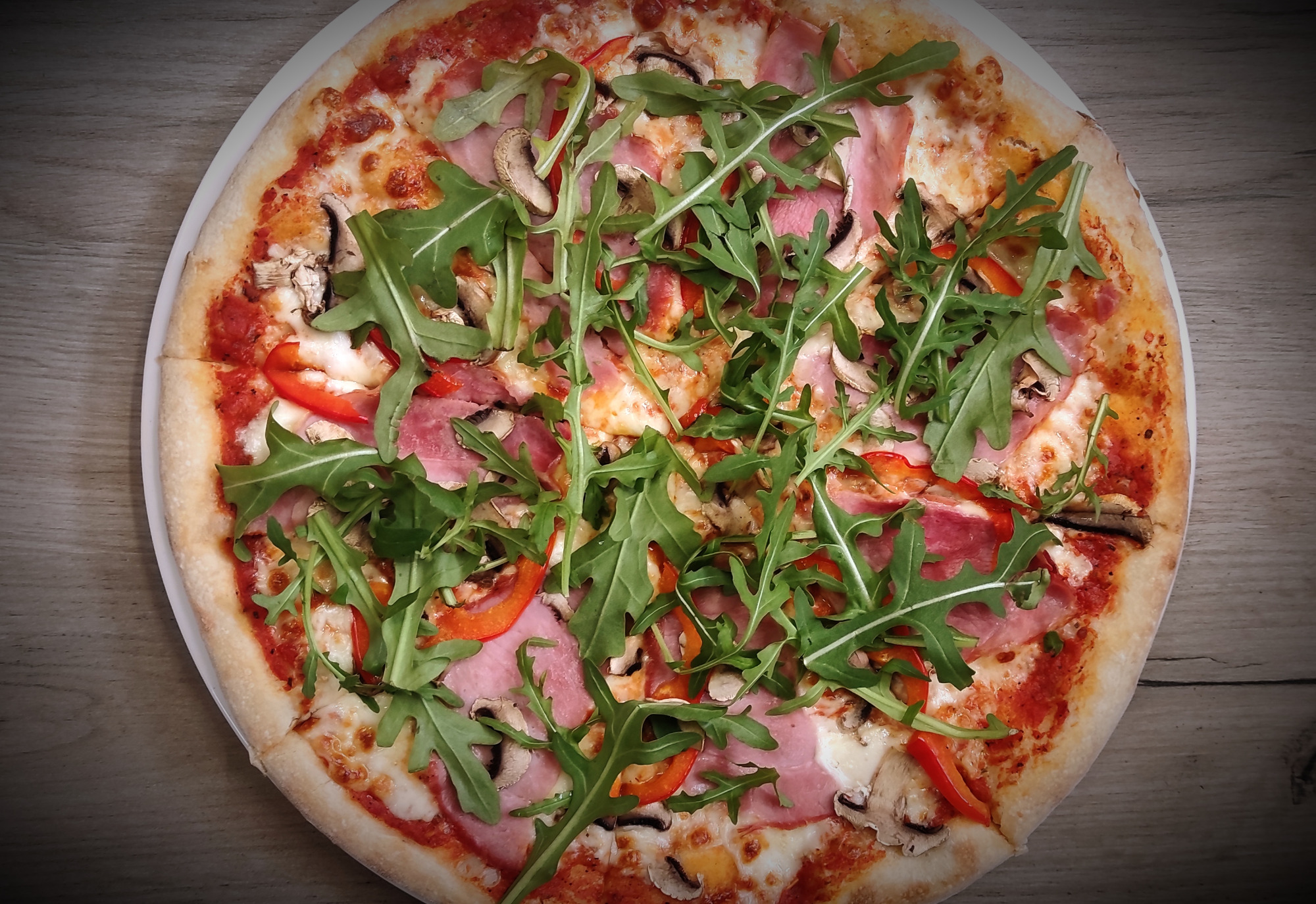 sos pelati (bazowy), mozzarella, pieczarki, kukurydza, pomidor, rukola3. Hawajska