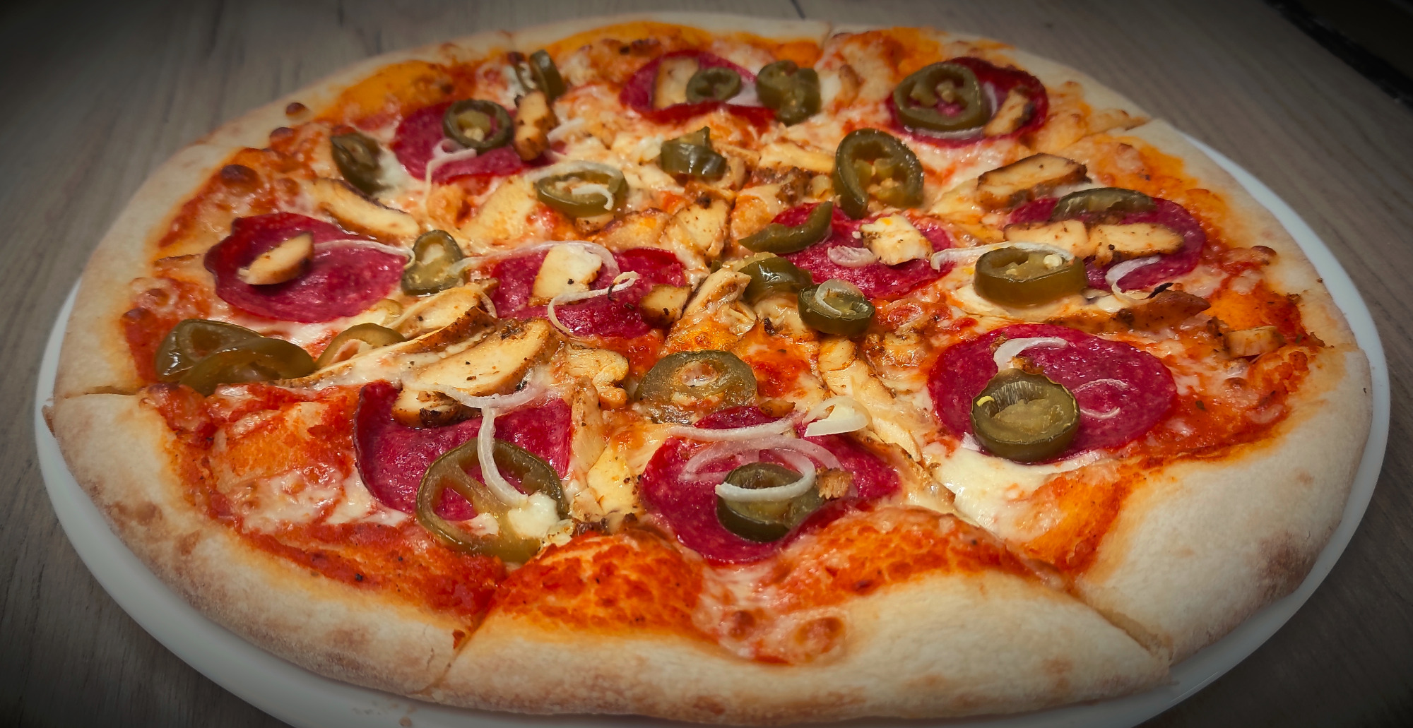 Pizza "Teściowej" to propozycja dla osób, które lubią ostre smaki. Podstawą jest sos pikantny, który dodaje potrawie dodatkowej ostrości. Warstwę sosu uzupełniają kawałki kurczaka oraz salami, co nadaje pizzy mocnego smaku mięsa. Cebula i papryczki Jalapeño dodają jeszcze więcej pikanterii, a kremowa mozzarella sprawia, że każdy kęs jest rozpływający się w ustach. Ta pizza z pewnością zaspokoi apetyt nawet na najbardziej wymagających smakoszy.